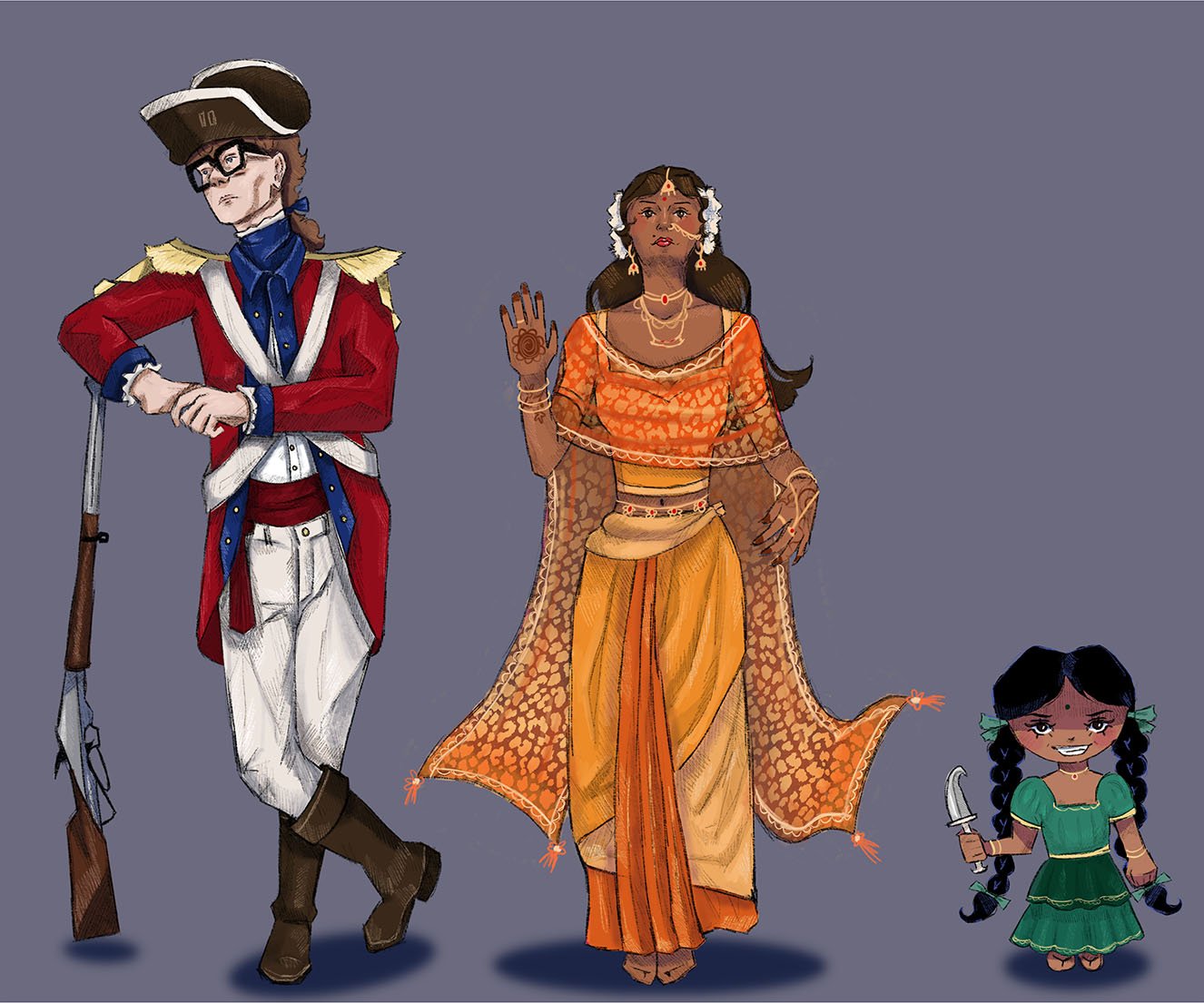 With the setting being the 18th century, I created two Indian sisters and a British soldier, as a nod to my heritage. I drew inspiration from traditional Indian garments and British military uniforms from the period of colonial rule in India, incorporating elements like intricate textiles, silhouettes, and regalia to reflect the cultural and historical context.