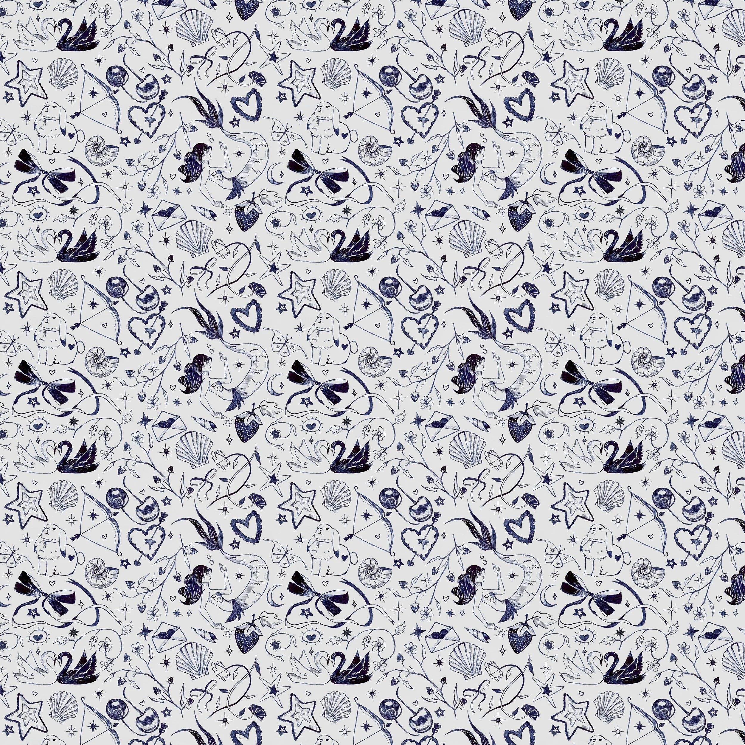 This pattern was a fun project for my materials and techniques class, where I hand-inked a cute, “girly” repeat design with motifs I’d love to see on merchandise. This was my first time learning to create a repeat pattern, which was a very interesting process to learn; it introduced me to the world of surface design.mockups