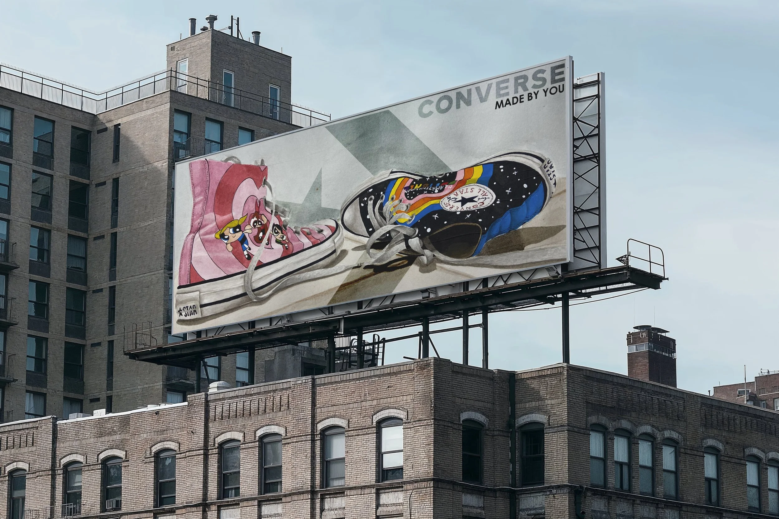 This still life painting is of my favourite pair of shoes that I painted during the pandemic. They have now started to show more severe signs of wear and tear; thus, to memorialise them, I decided to use them as my object for my still life study. Personally, I believe that this has been one of my most successful attempts at realism and a great learning opportunity with watercolour, as I was able to transfer every fold and stain of the shoes onto the paper. These shoes have been with me for years, wanting to take this opportunity to create promotional media for Converse, as this aligns with one of their brand slogan "made by you". mockup