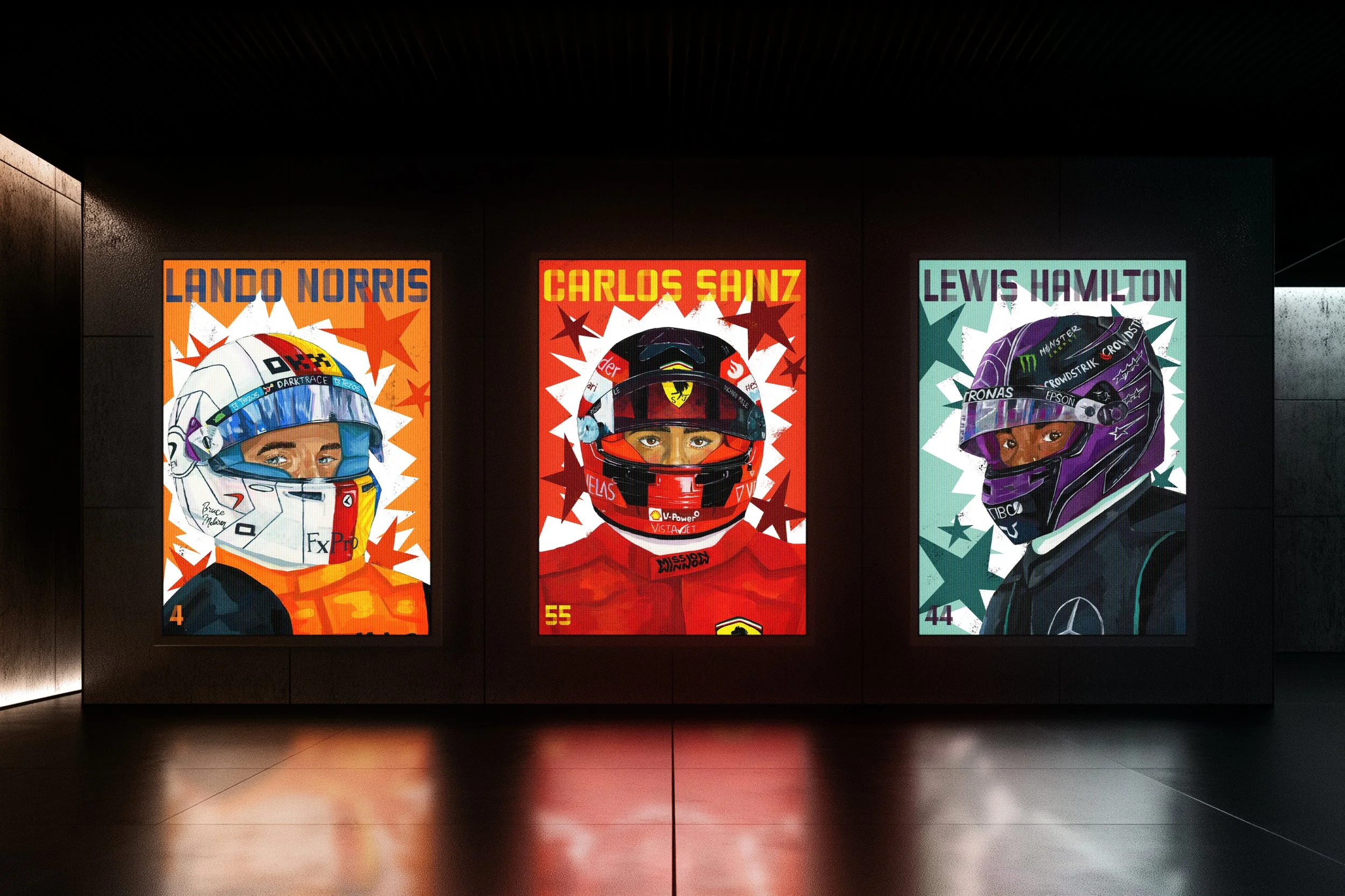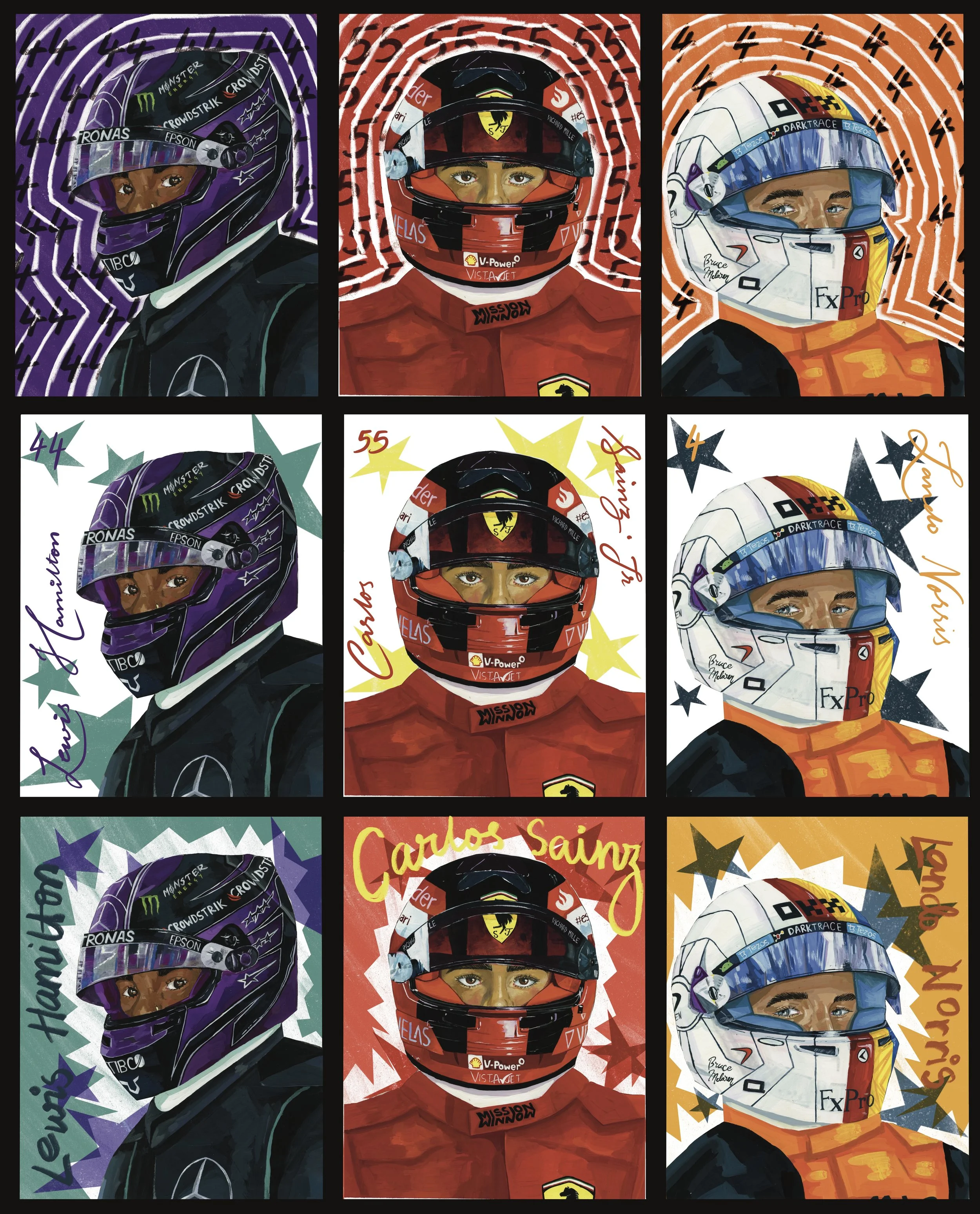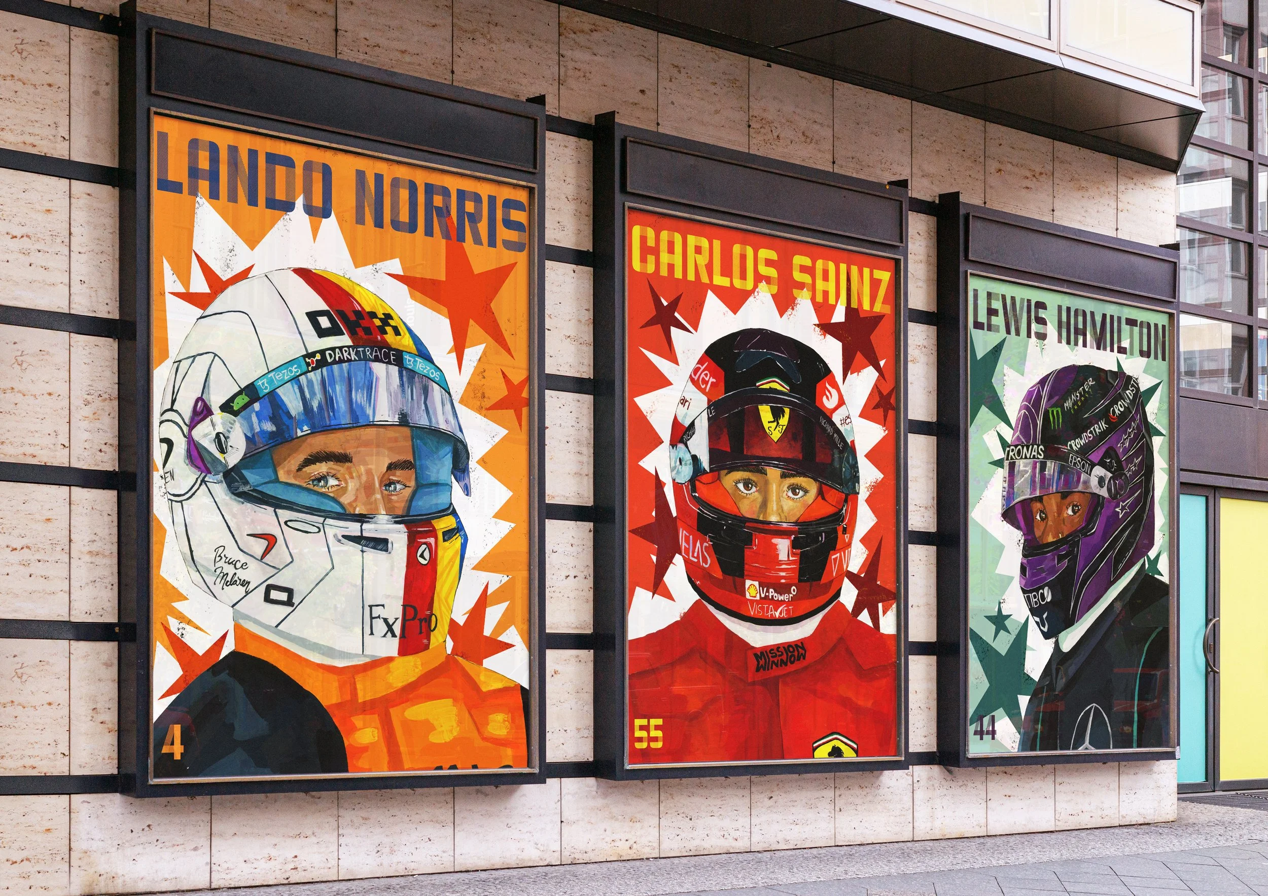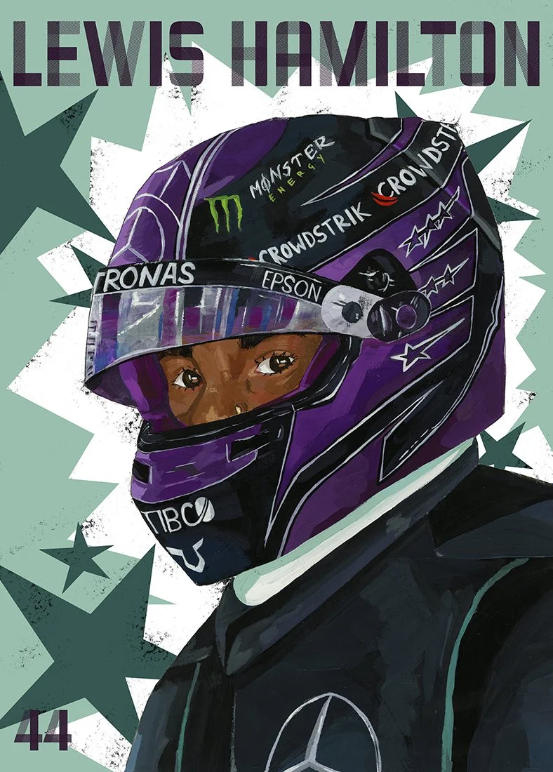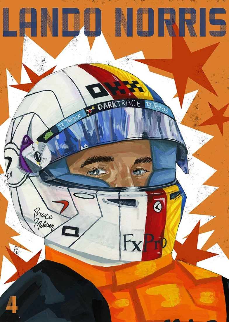 This project memorialises F1 drivers and their teams from my favourite grids between 2021 and 2024. I combined my love for painting and motorsport by illustrating detailed helmets in gouache, then bringing them into Photoshop to create bold, graphic-style posters that capture the energy and aesthetic of Formula 1. Merging traditional and digital media allowed me to celebrate both the artistry and adrenaline of the sportmockups