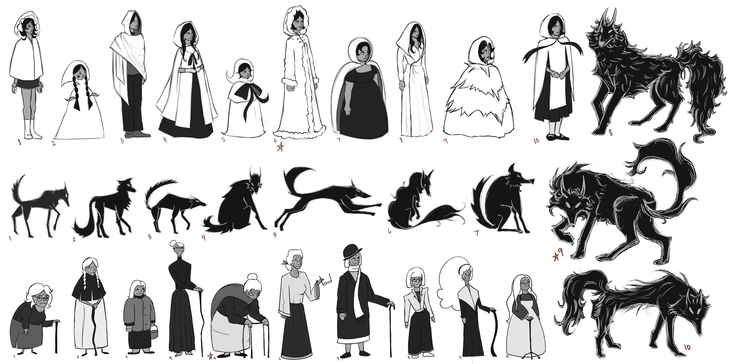 Thumbnails for all spreadsLinework for chosen spreadsThumbnails for characters