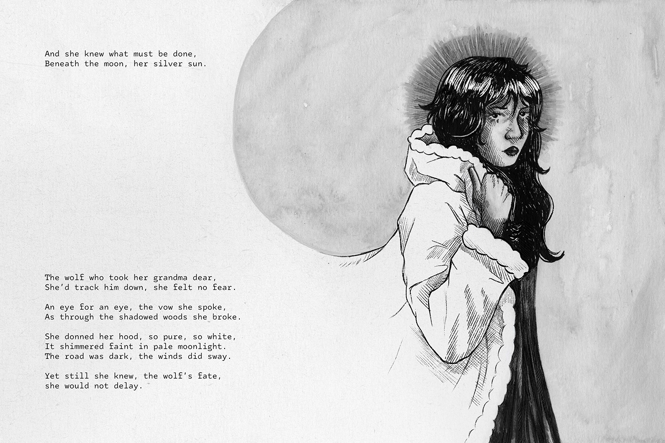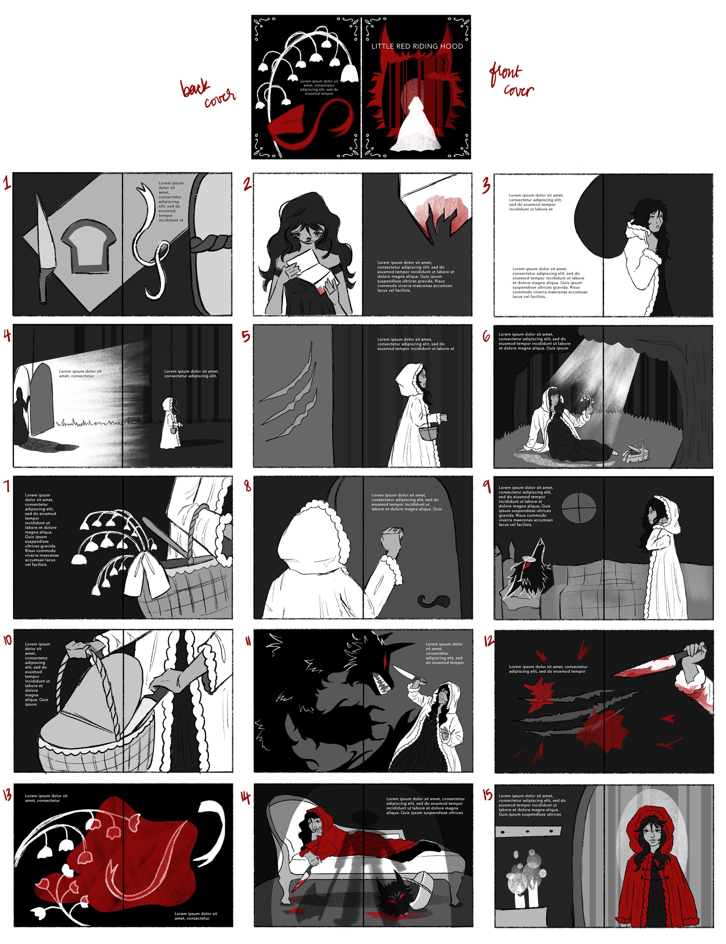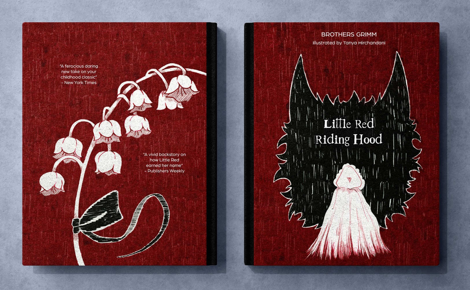 This work features front and back cover art plus 4 spreads for my reimagined version of the Red Riding Hood story. Using a limited colour palette and hand-inked spreads, this narrative and corresponding pieces explore the tale’s darker undertones and emotional depth through a contemporary visual lens.mockup