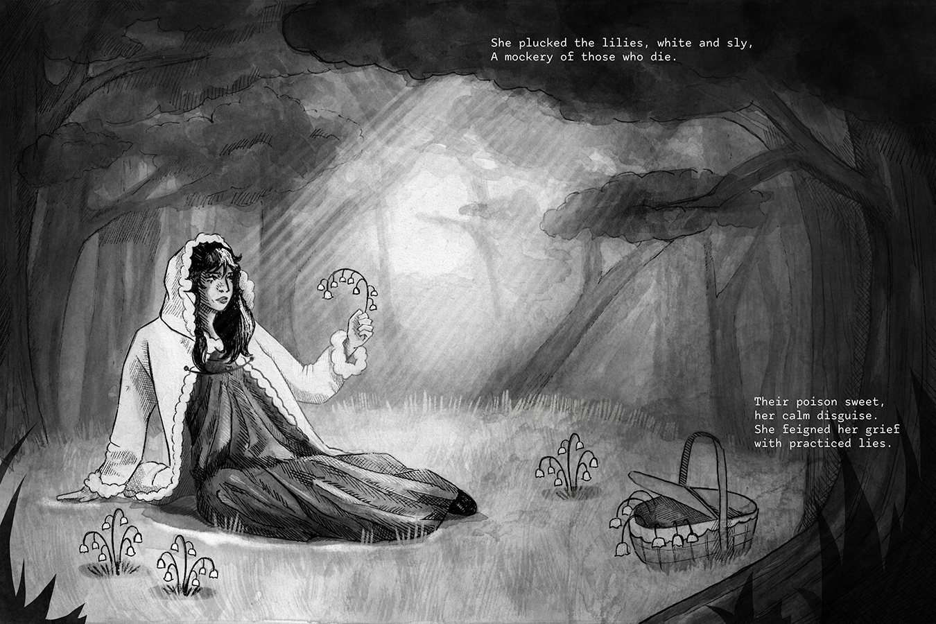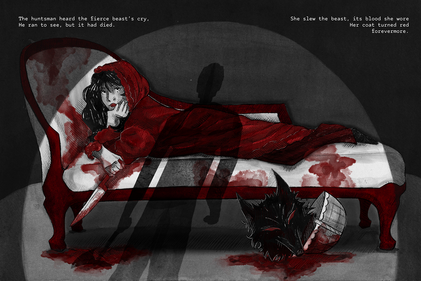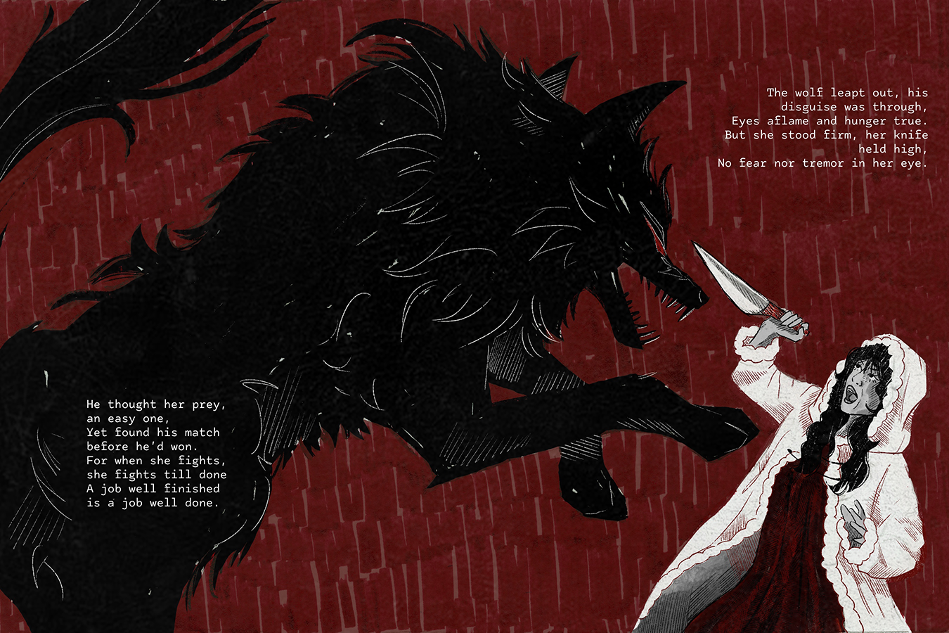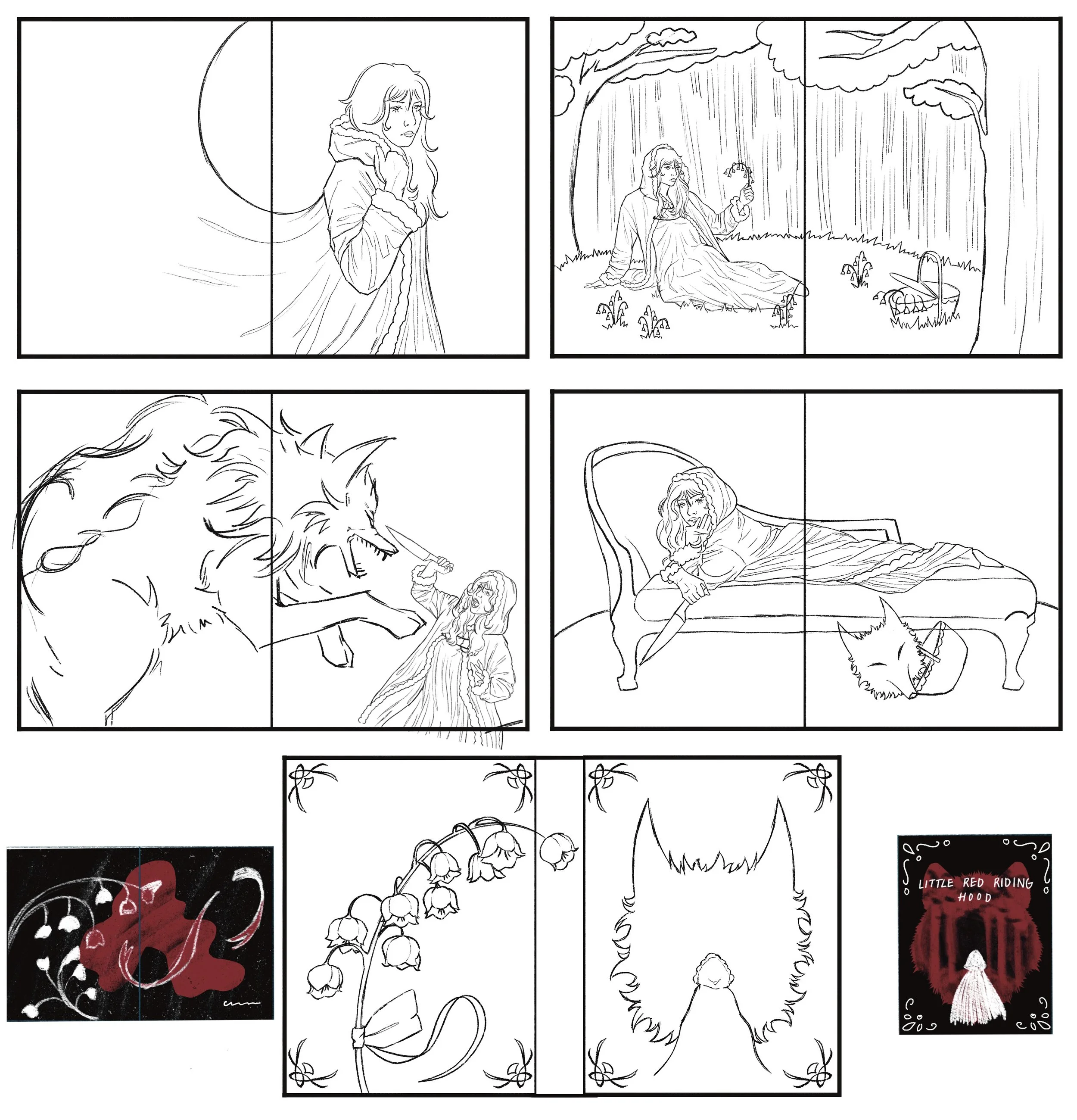 This work features front and back cover art plus 4 spreads for my reimagined version of the Red Riding Hood story. Using a limited colour palette and hand-inked spreads, this narrative and corresponding pieces explore the tale’s darker undertones and emotional depth through a contemporary visual lens.mockup