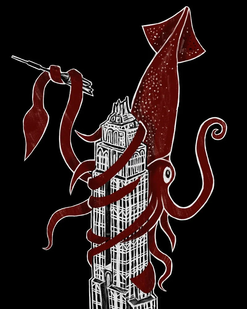 A full-page editorial illustration inspired by a New York Times article on rising sea levels threatening cities. I reimagined the iconic King Kong atop the Empire State Building by replacing him with a giant squid, symbolising the slow drowning of urban landscapes. This visual metaphor highlights the urgent threat of climate change while connecting imagery to provoke reflection.